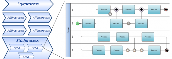 Pratar vi processer så behöver vi sätta Affären och därmed också kunden i fokus. Det är Affären (sättet som företaget tjänar pengar på) som företaget är till för, som ska utvecklas, optimeras och stödjas. Processerna rangordnas ofta i termer som styrprocesser, affärsprocesser och stödprocesser. Styrprocesser visar riktningen och sätter mål och krav. I affärsprocesserna sker ”verkstadsarbetet”, det är i dessa allt det fantastiska händer som bidrar till företagets resultat. Stödprocesserna är de som är lite lurigare att förstå sig på. Dessa processer är de som ska se till att affärsprocesserna flyter på så smidigt som möjligt. Att ekonomin rullar på som den ska, att alla medarbetare får sin lön i rätt tid, att internpost kommer till rätt mottagare, att samtliga IT-system fungerar som det är tänkt.
